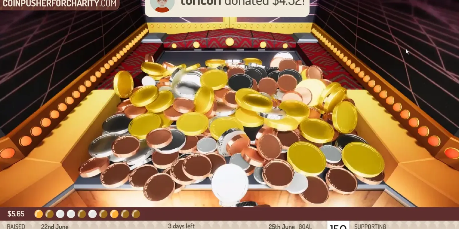 A coin pusher is streamed to Twitch, and you add coins to the board by donating to a charity.